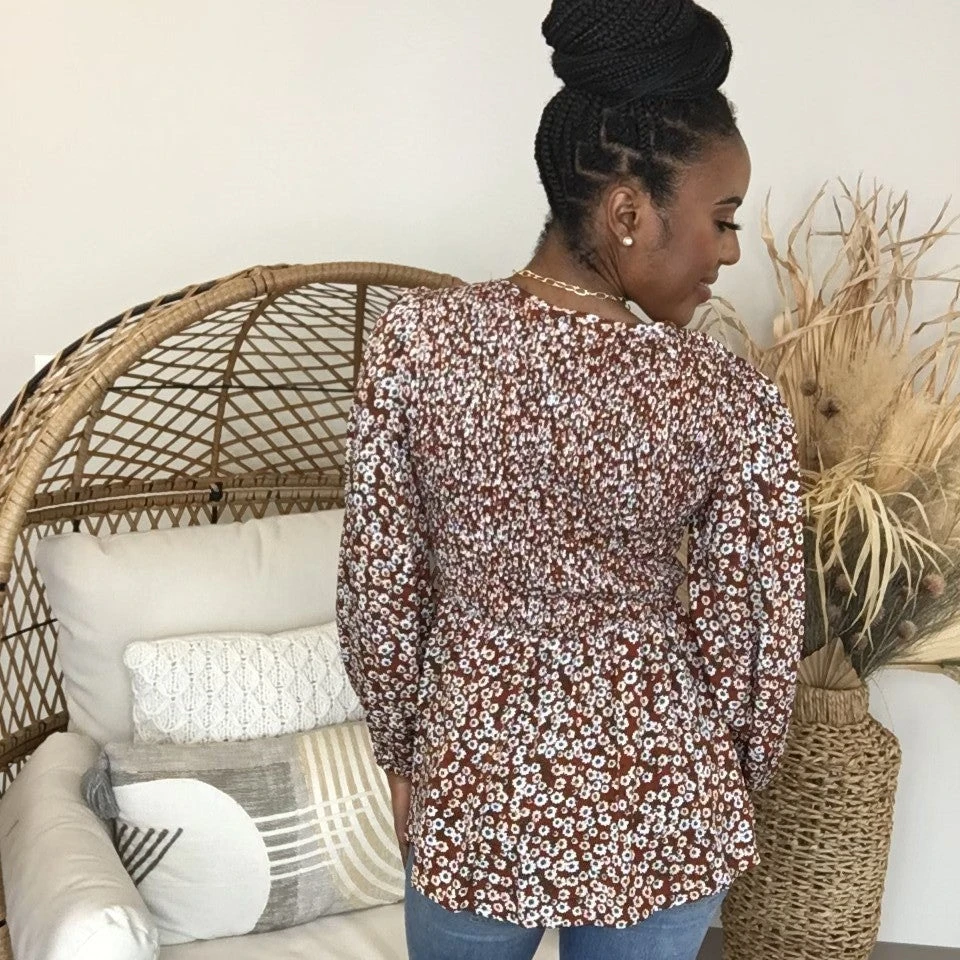 Features: floral print, smocked, long sleeve, v neck