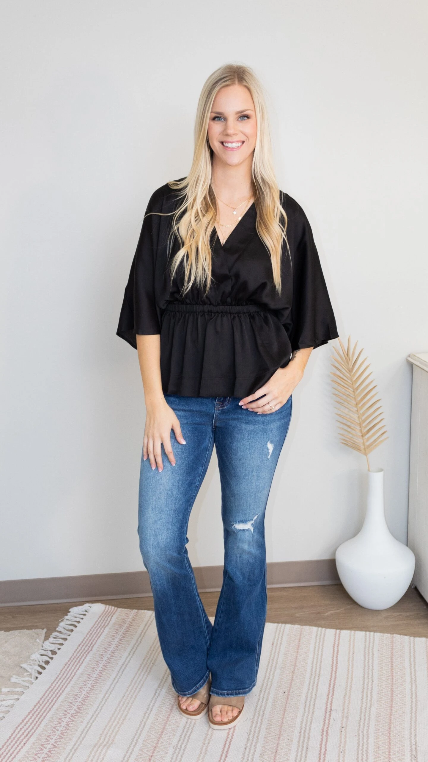Need a top you can take from the office to a night out? We have you covered! The City Streetlights Top is so flattering! Pair it with black pants for a day at the office or jeans for a night out!