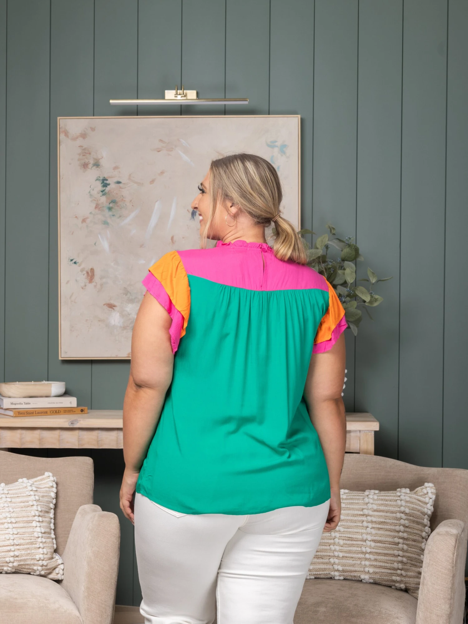 Features: Color Block, Flutter Sleeves,