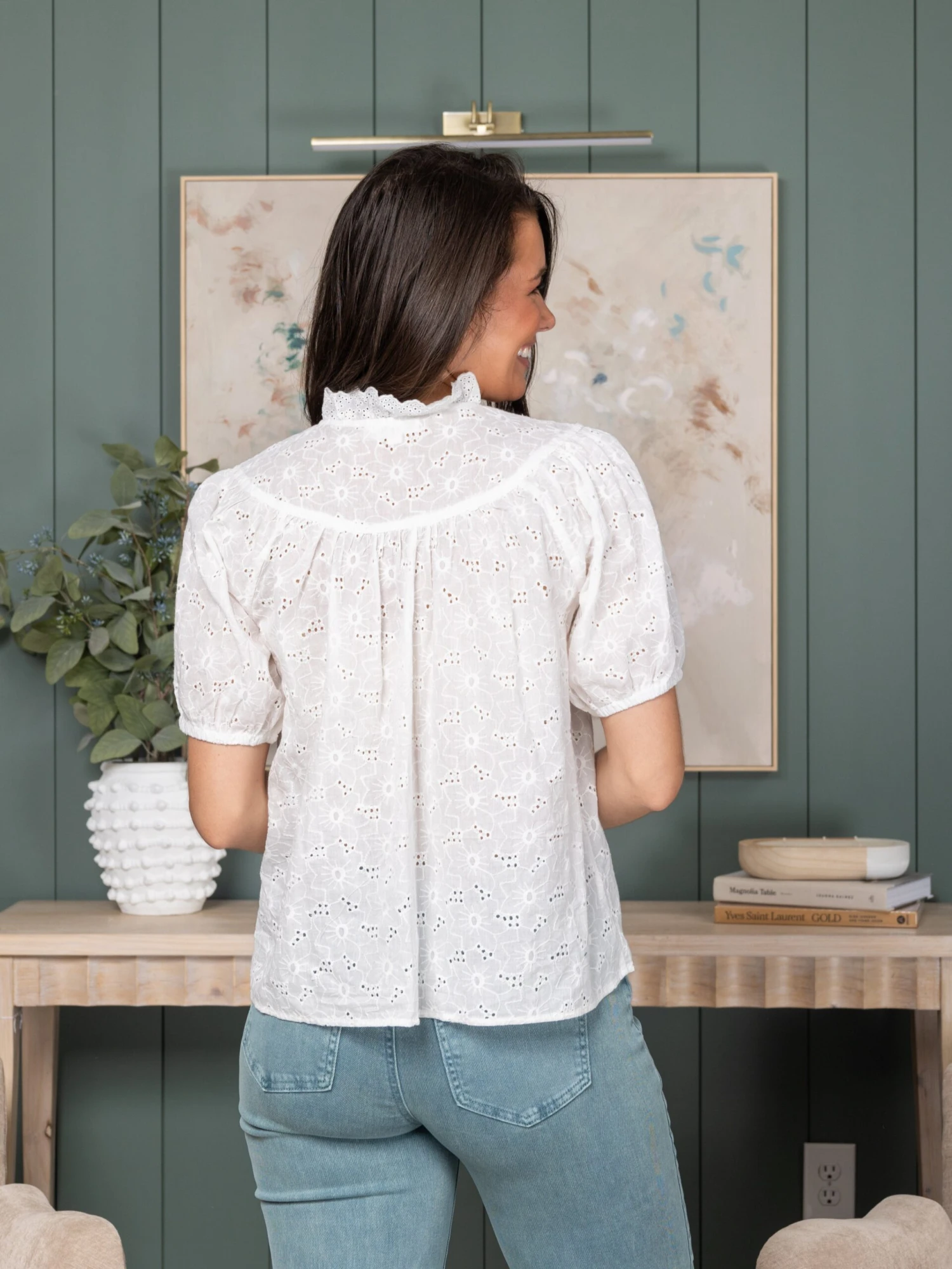 Embroidery Fabric Lightweight Button Down Mock-neckline Short Sleeves Top | S-XL