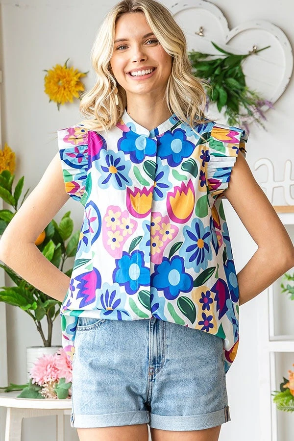 Floral Print Mandarin Collar Flutter Sleeve Blouse | S – 3X