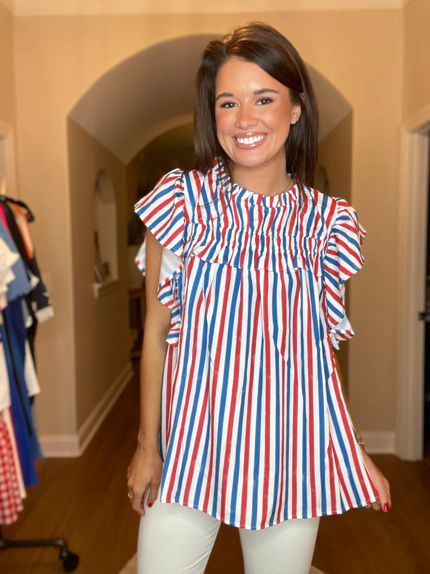 Features: Ruffle Neck, Flutter Sleeves, Striped