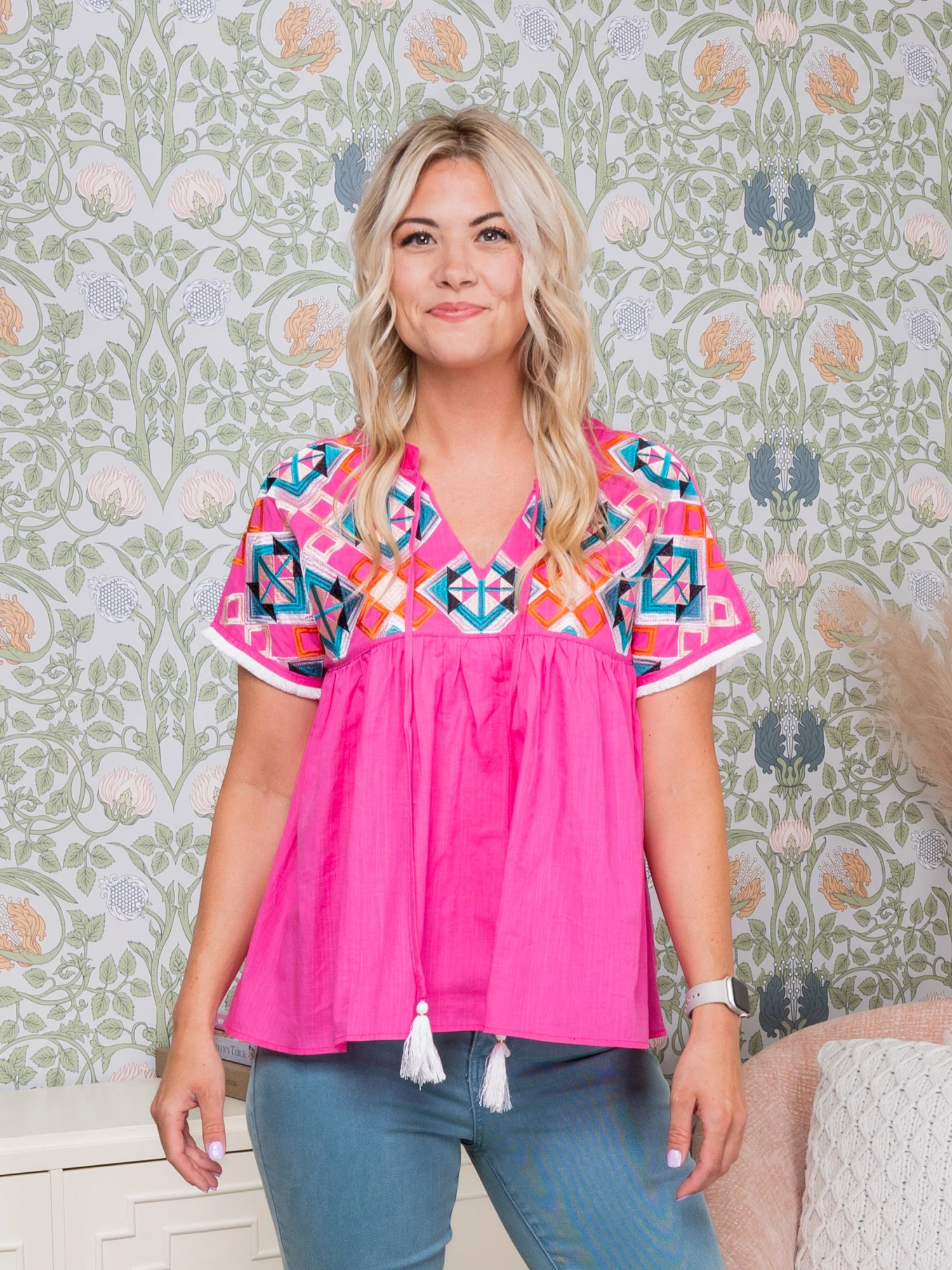 Geometric Embroidered Short Sleeve Tassel Tie V-Neck Blouse | S-XL