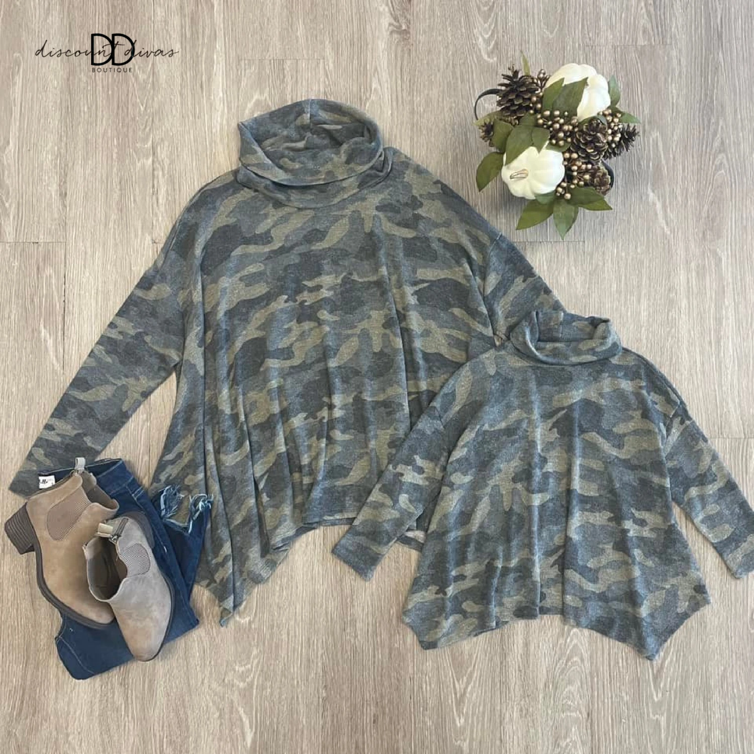 Features: camouflage print, turtleneck, long sleeve, oversized, side slits