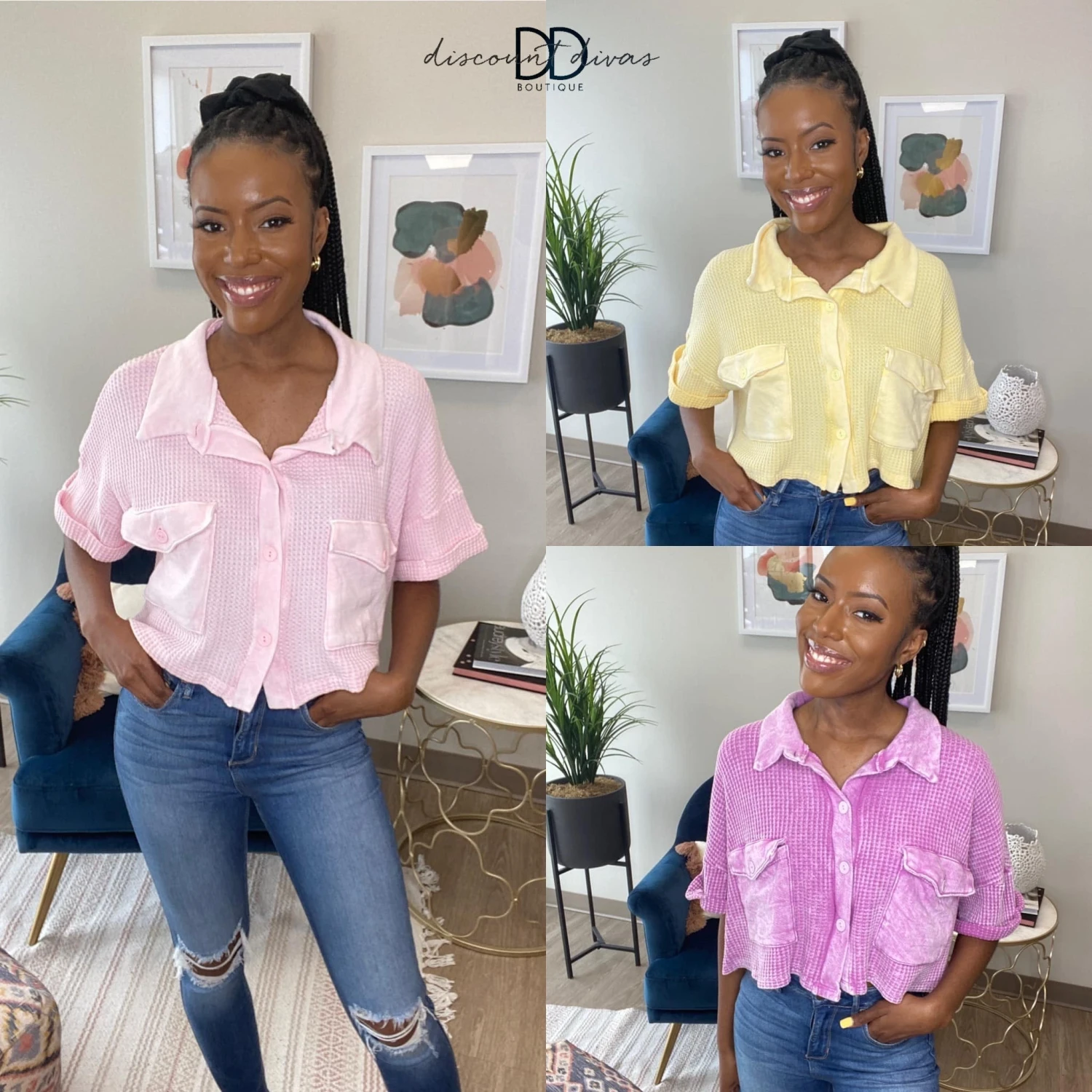 The “Going Through It Shirt” has arrived! This cropped summary up shirt is a must have! With a washed design, this one is so stylish! Perfect for summer, don’t miss out on this one! Pair with denim and you are all set!