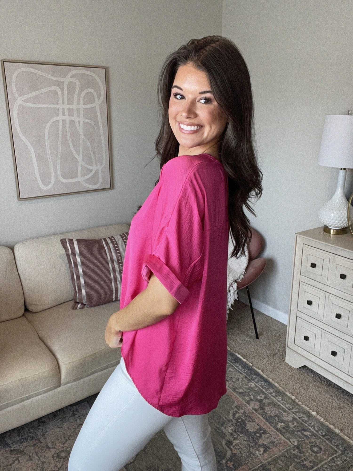 Features: solid print, v neck, short cuffed sleeves, loose fit