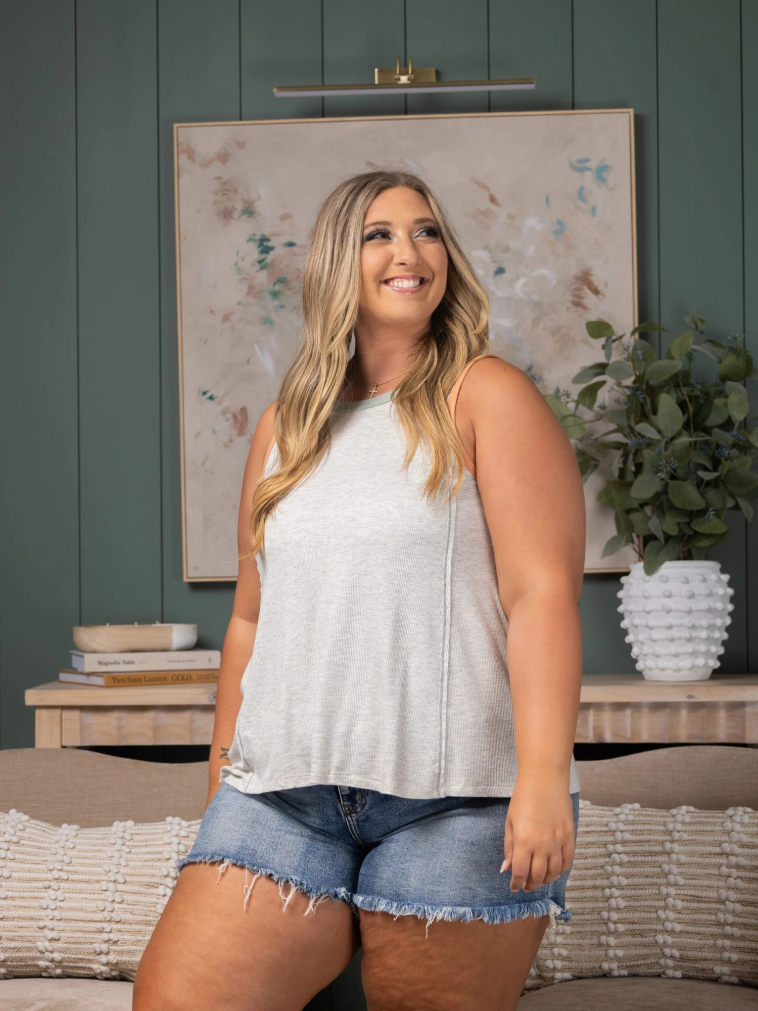 Erin is 5’8, 36C bra, typically wears size L/XL in tops and 14/16 in denim. Wearing size L