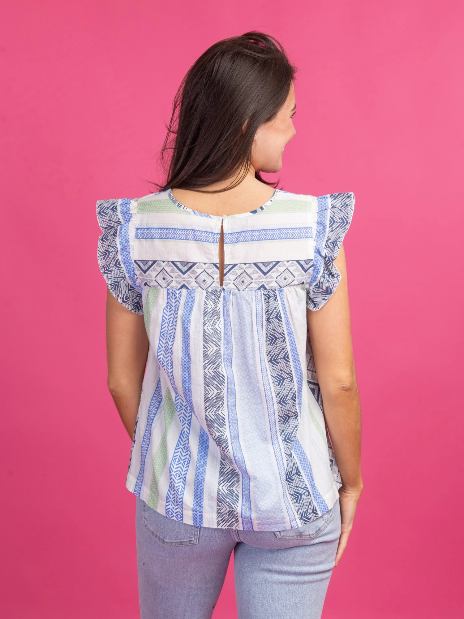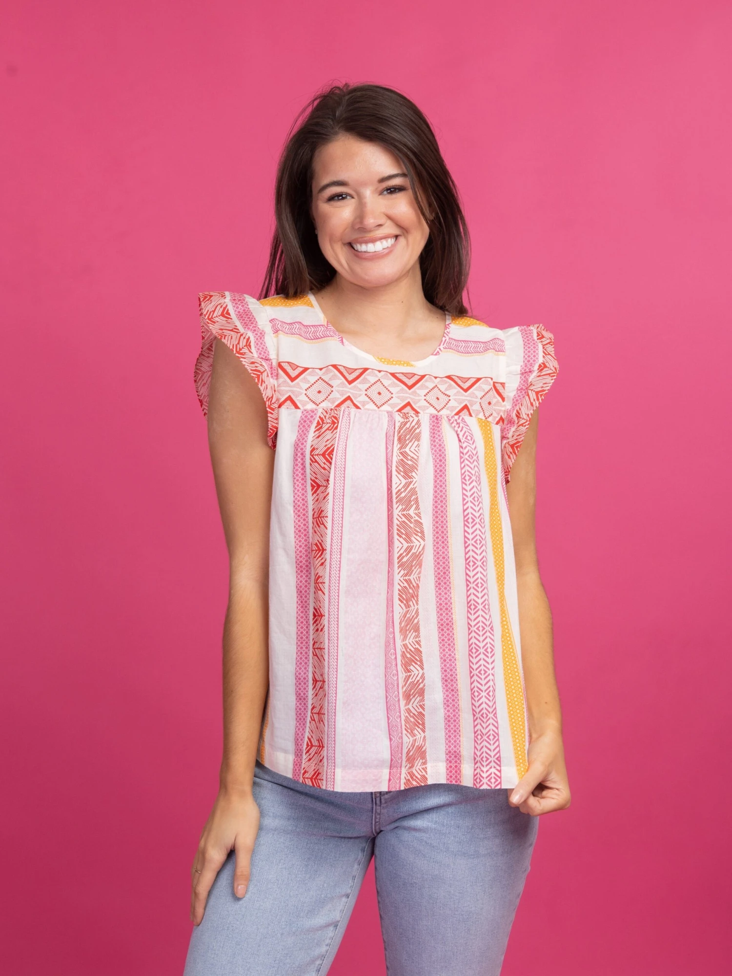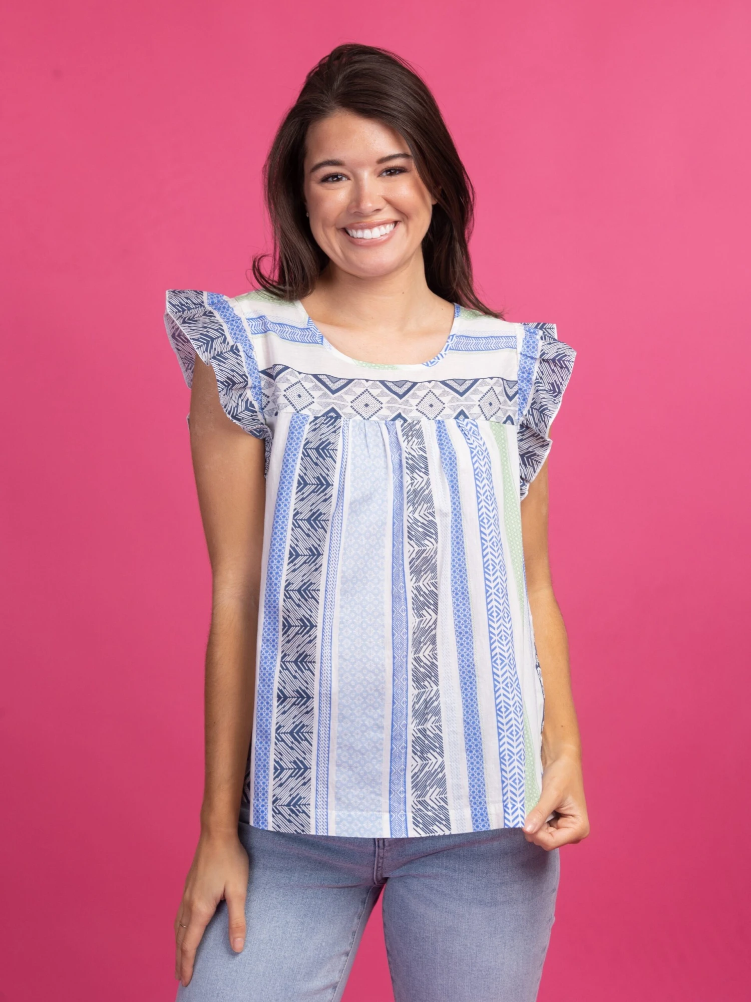 This multi-pattern design screams spring! The adorable, ruffled cap sleeves make this look an automatic add to cart!