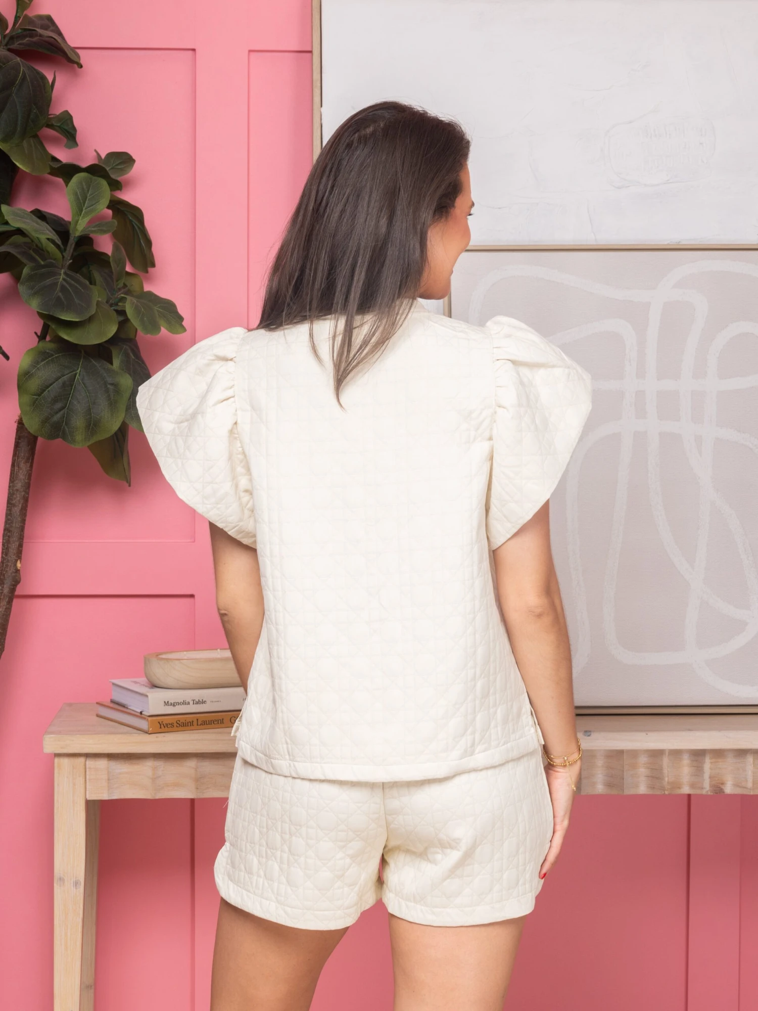 Features: Quilted textured top, short ruffled sleeves, rounded neckline