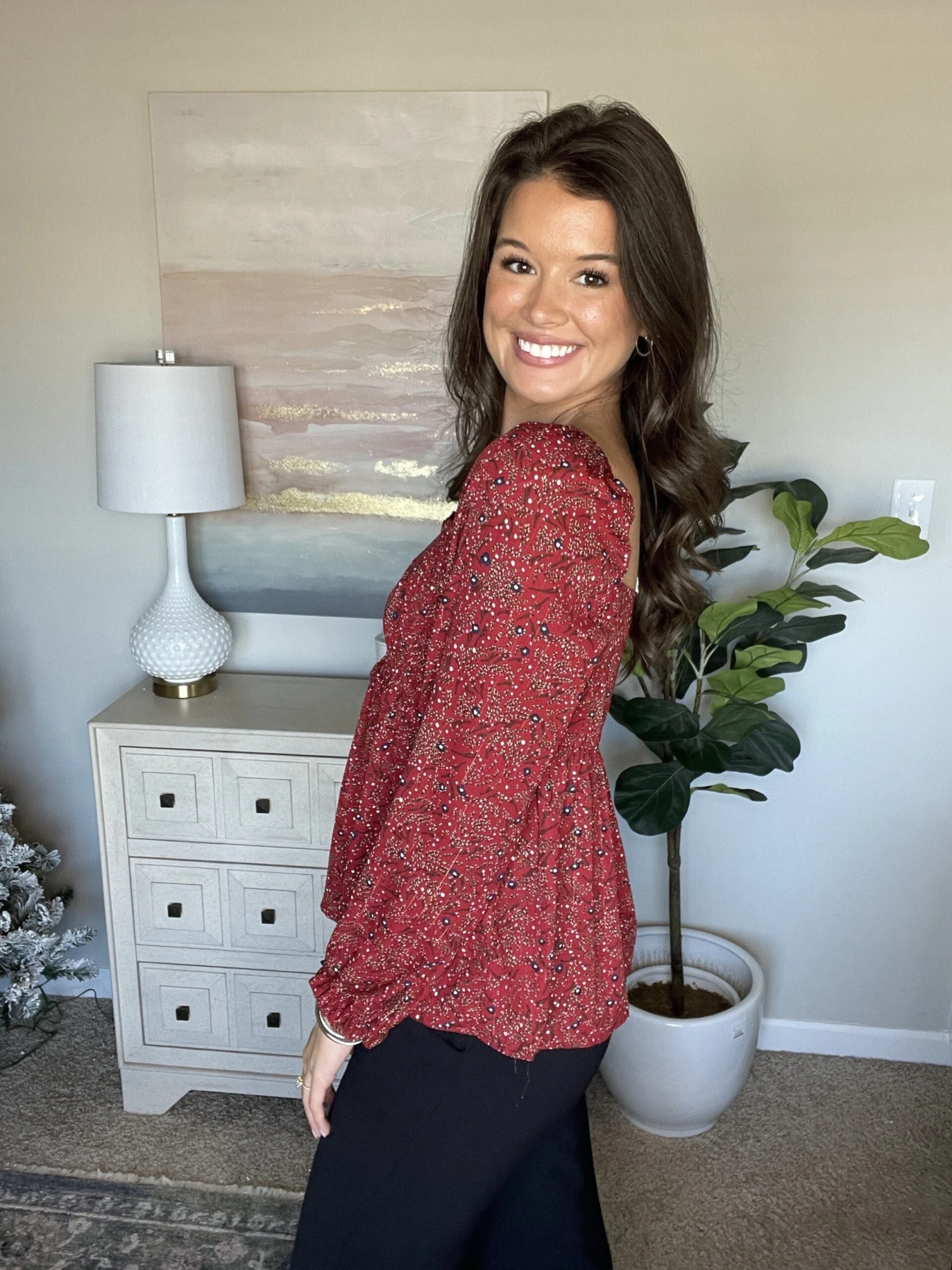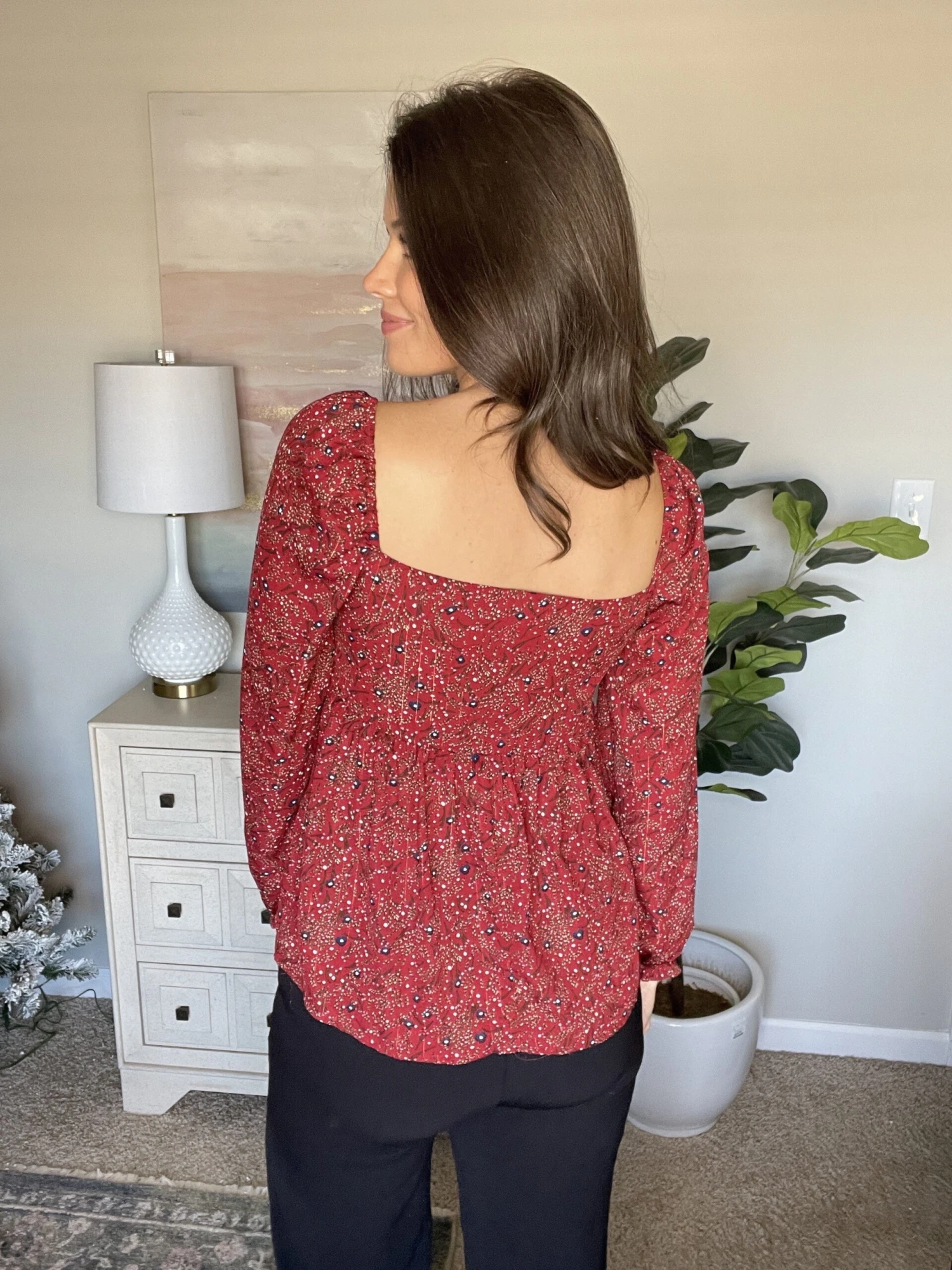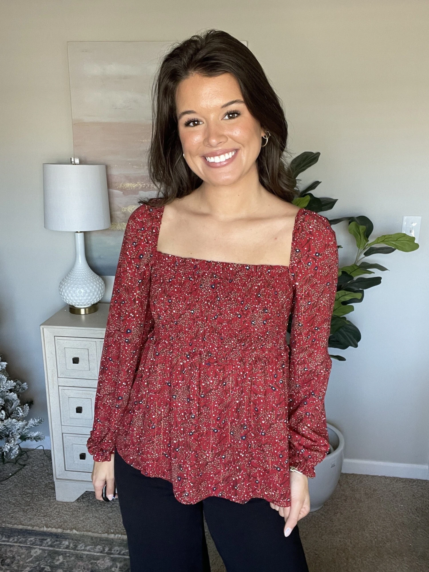 Features: floral print, metallic threading detail, long puff sleeve, smocked