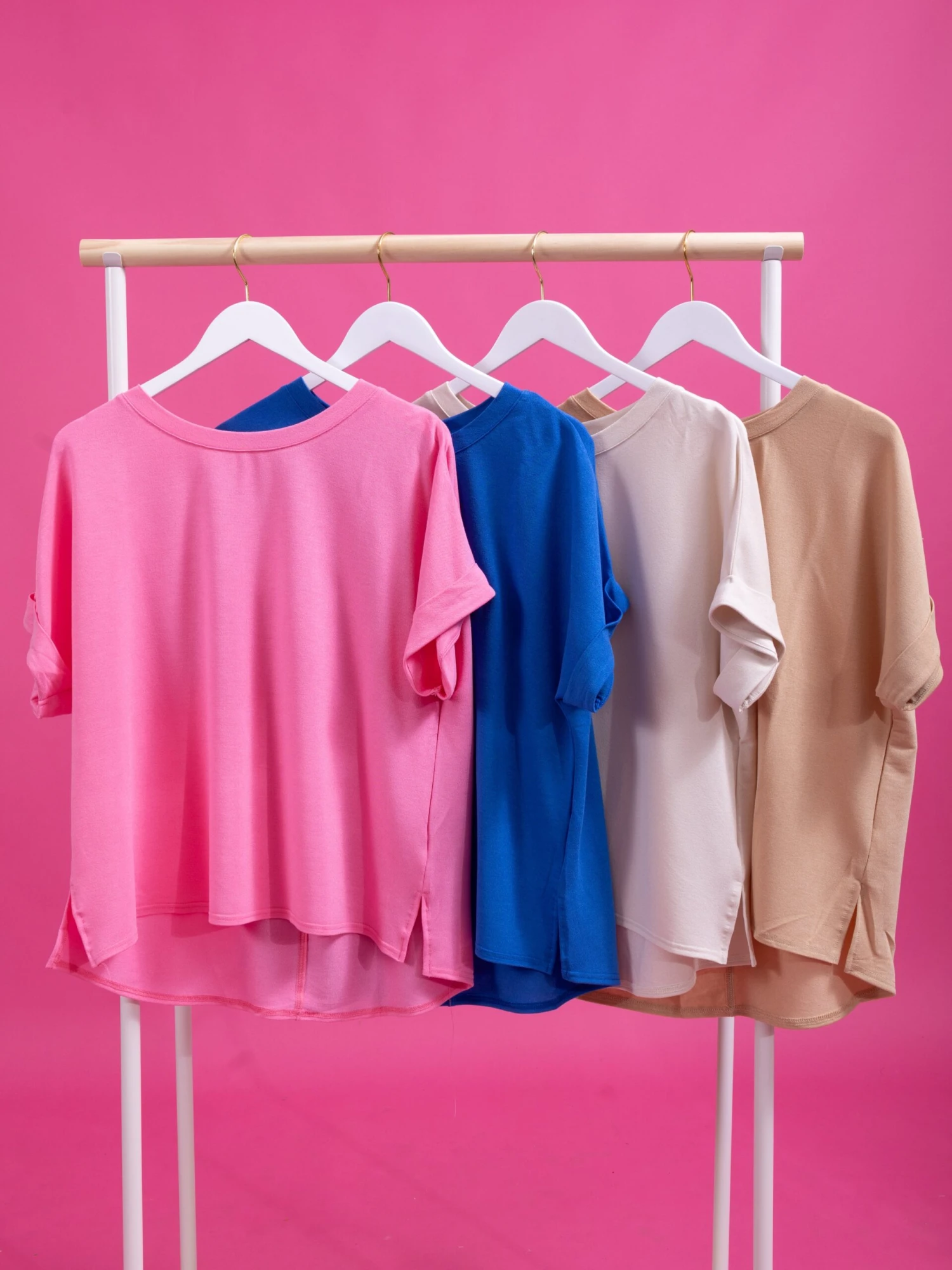 Features: Round Neck, Short Cuffed Sleeves, Side Slits