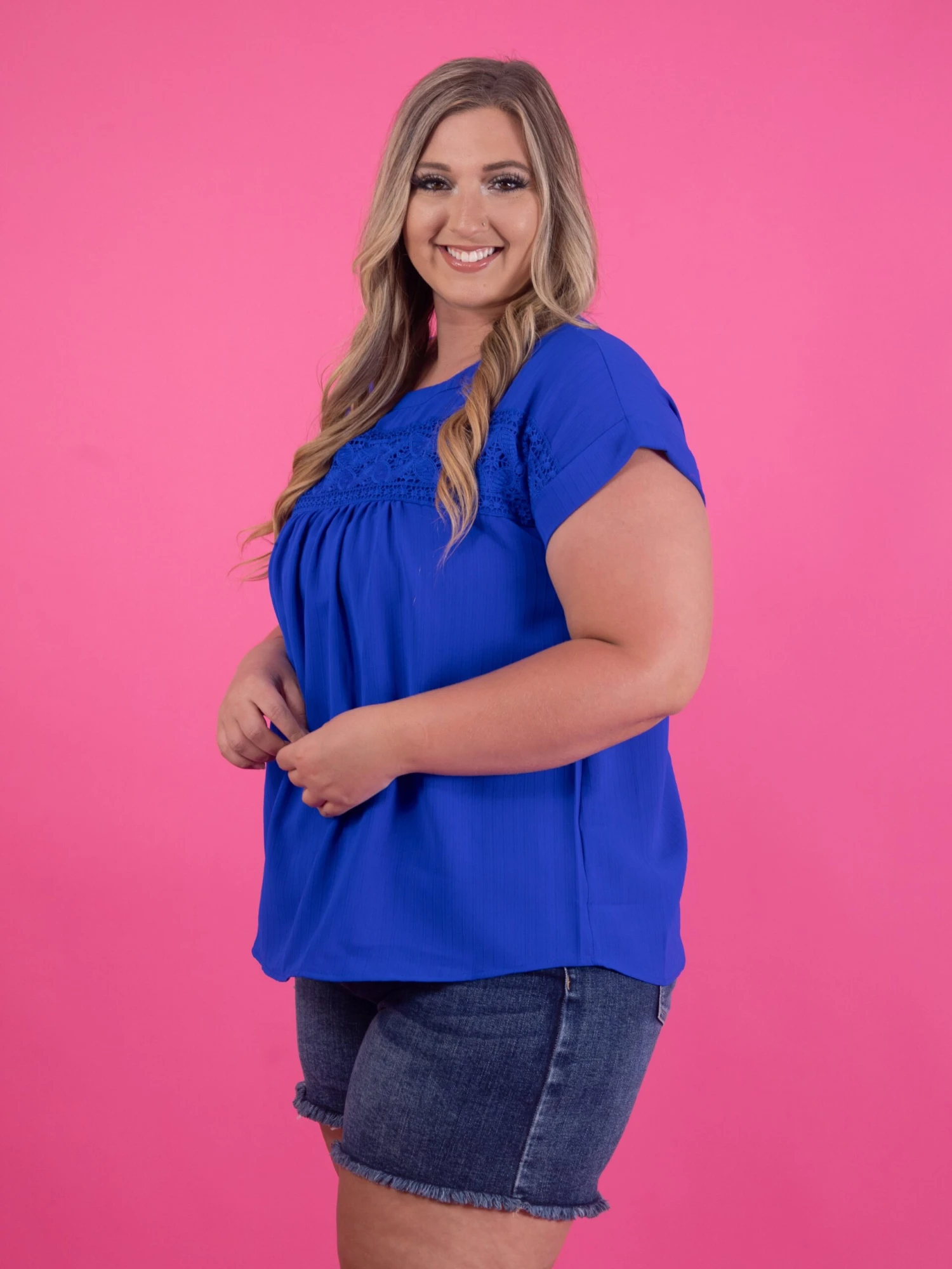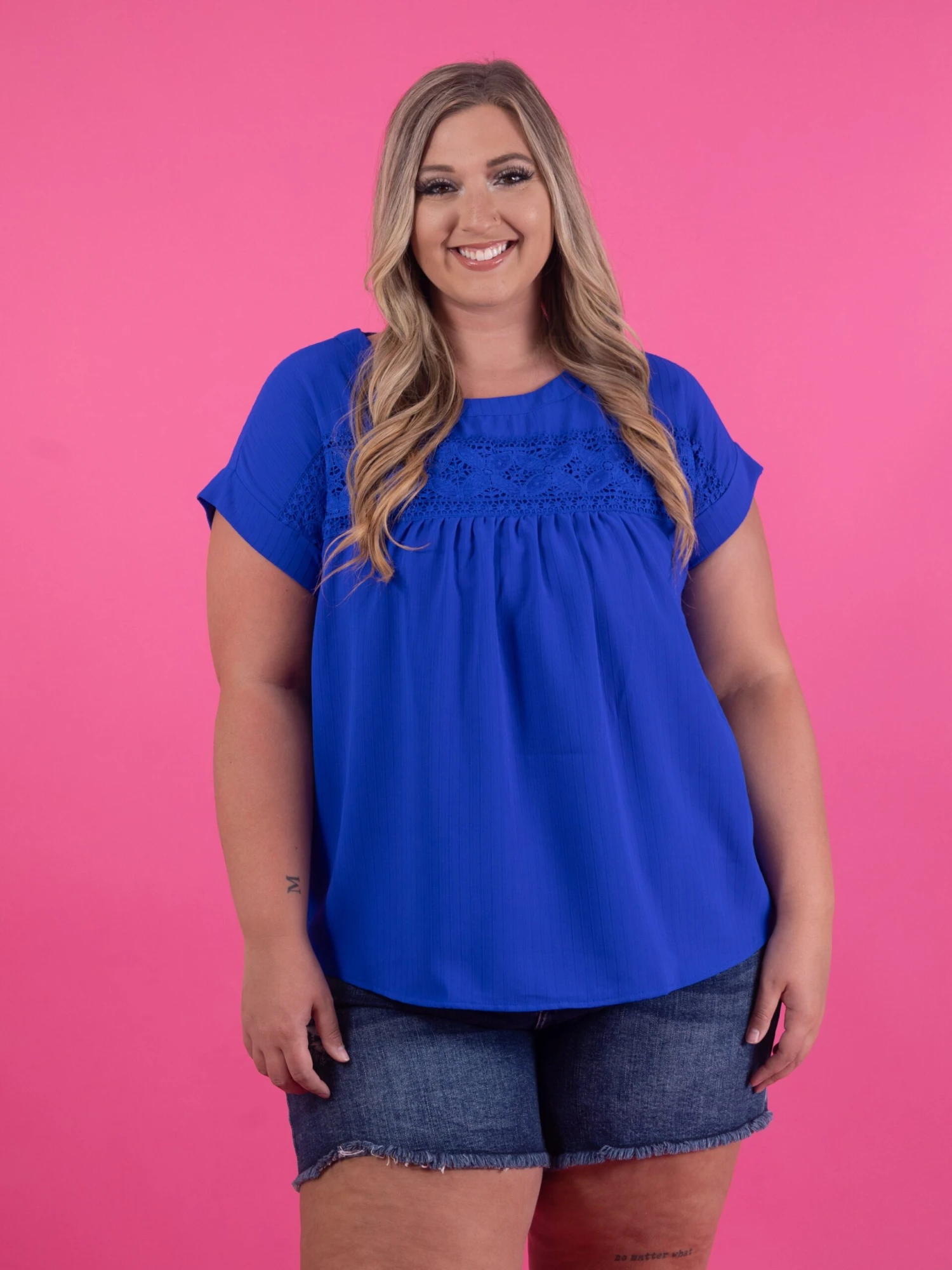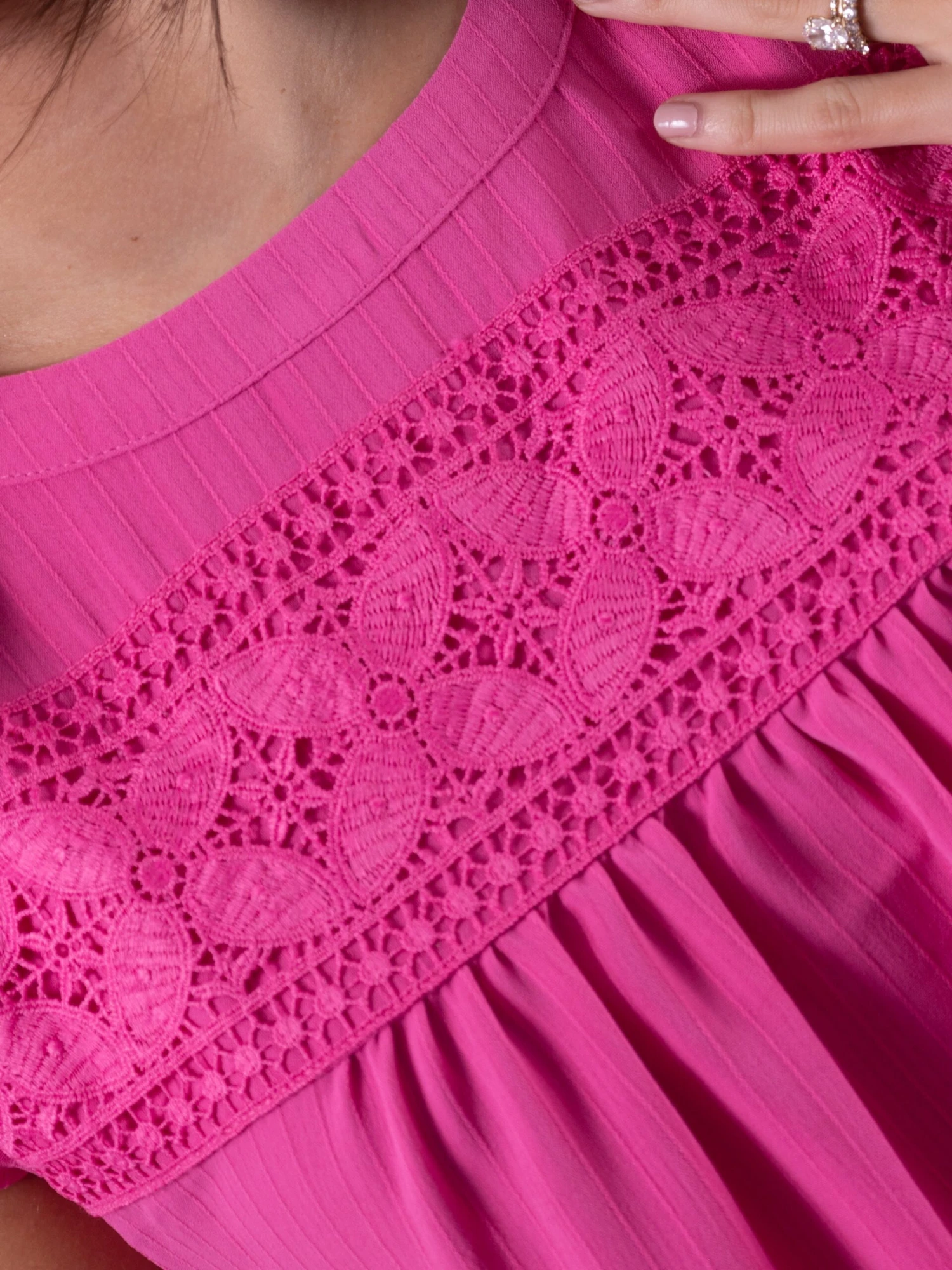 Features: Round Neck, Short Sleeves, Floral Eyelet, Back Button Detail