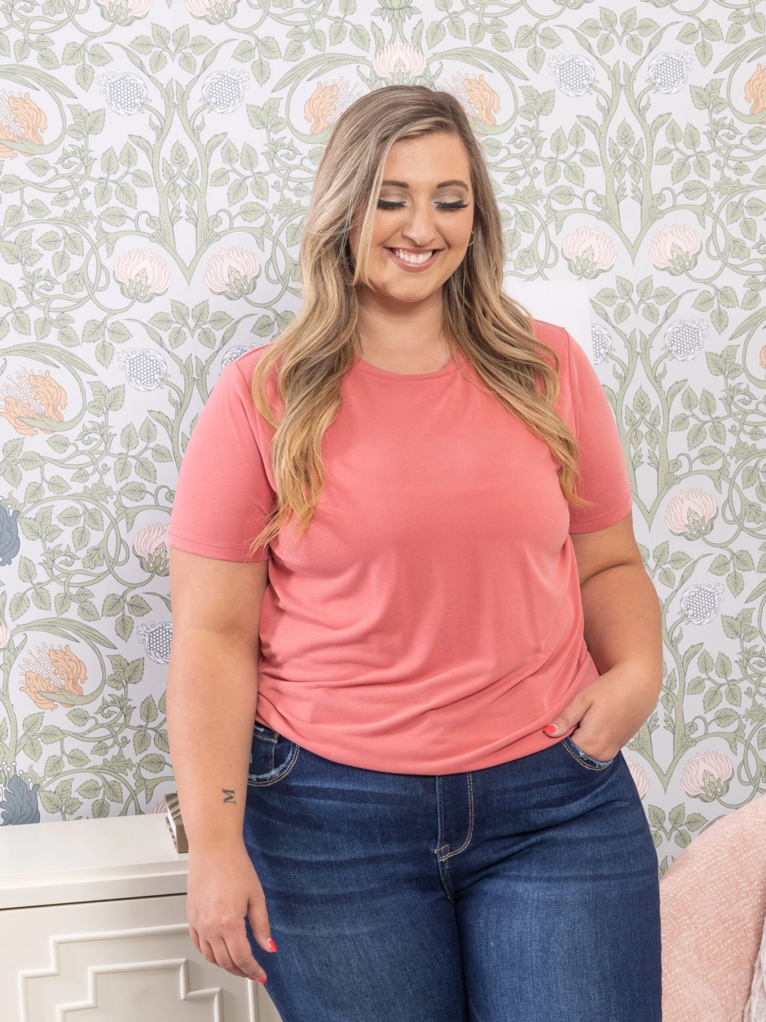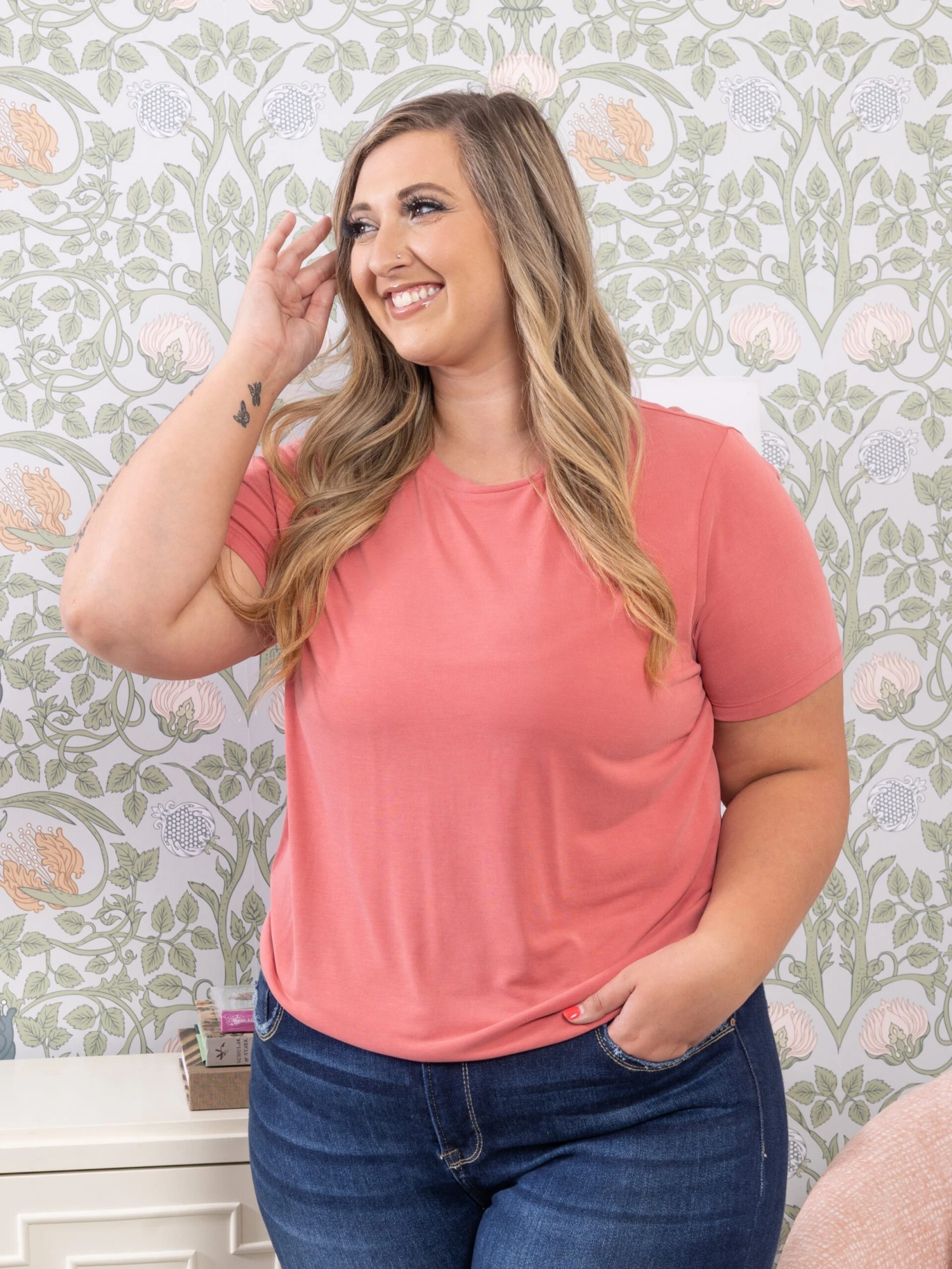 Erin is 5’9, 36C bra, typically wears size L/XL in tops and 14/16 in denim. Wearing size L