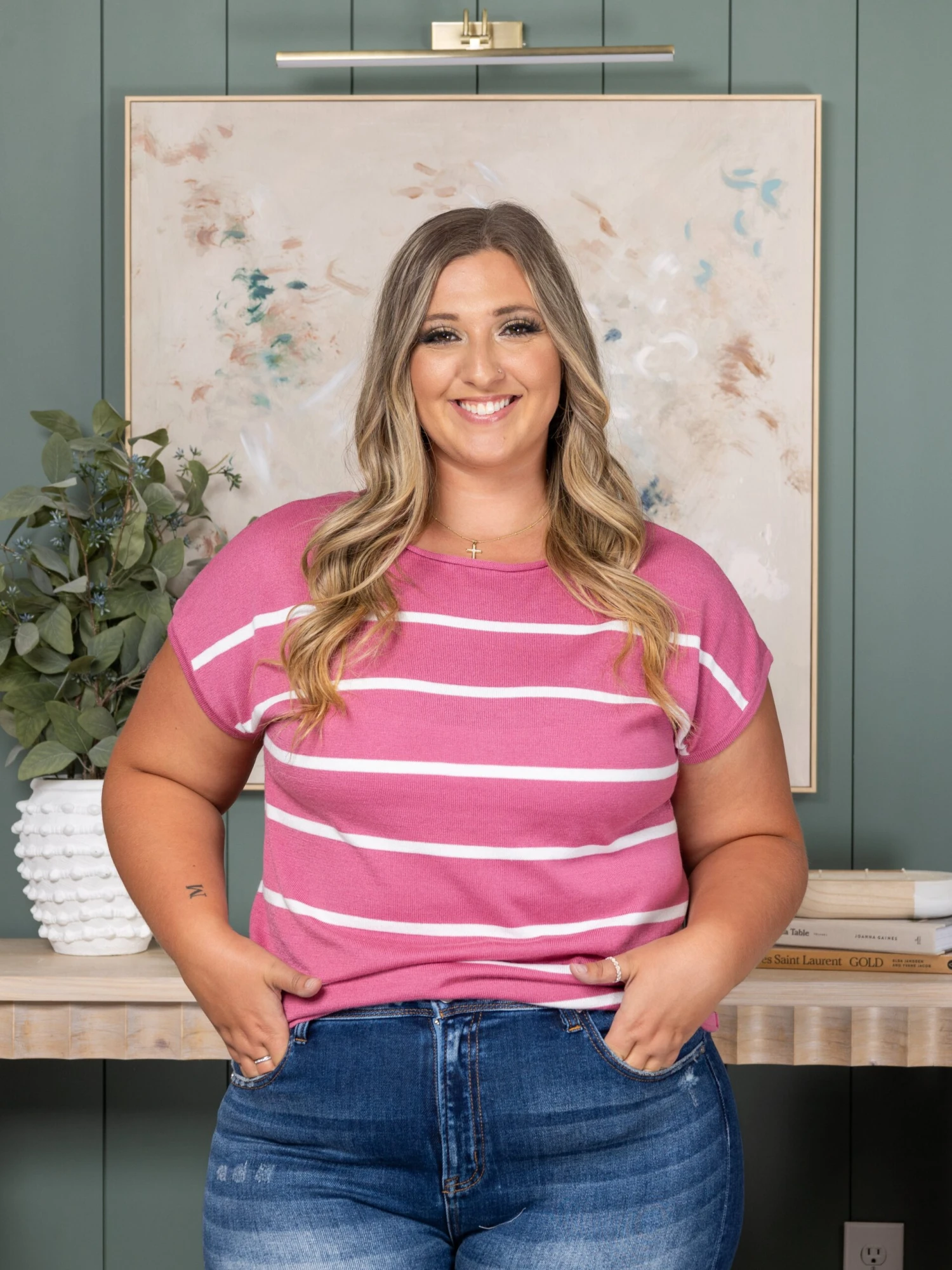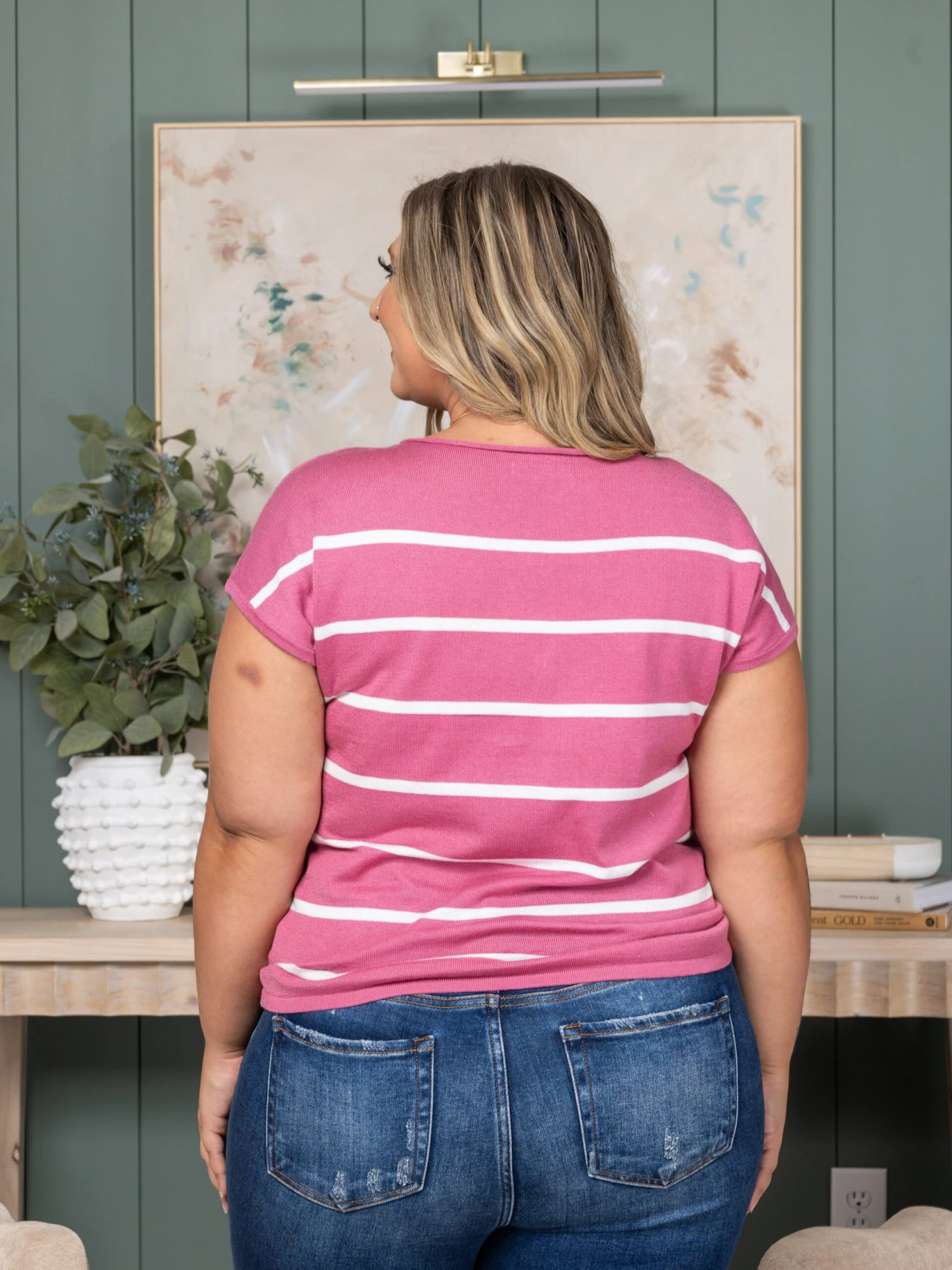 Features: Wide Crew Neck Short Sleeve Stripe Pullover Sweater