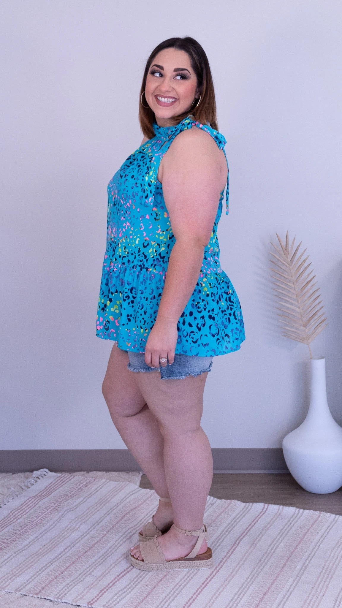Talk about making a statement!! The Summer Solstice Animal Print Halter Top is hot stuff!! We absolutely love the muticolor animal print! Pair this top with white denim shorts and our cute strappy sandals for a complete look!!