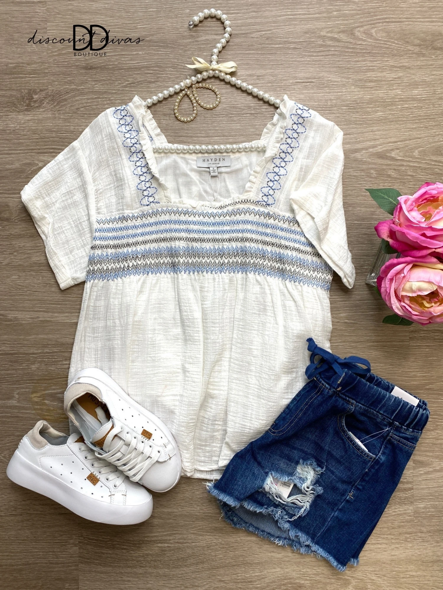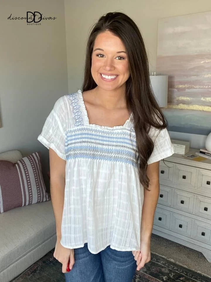 The “Taking A Seat Top” has arrived! This adorable smocked top belongs in your wardrobe! You can’t go wrong with the embroidery! Be sure to snag one before they are gone!