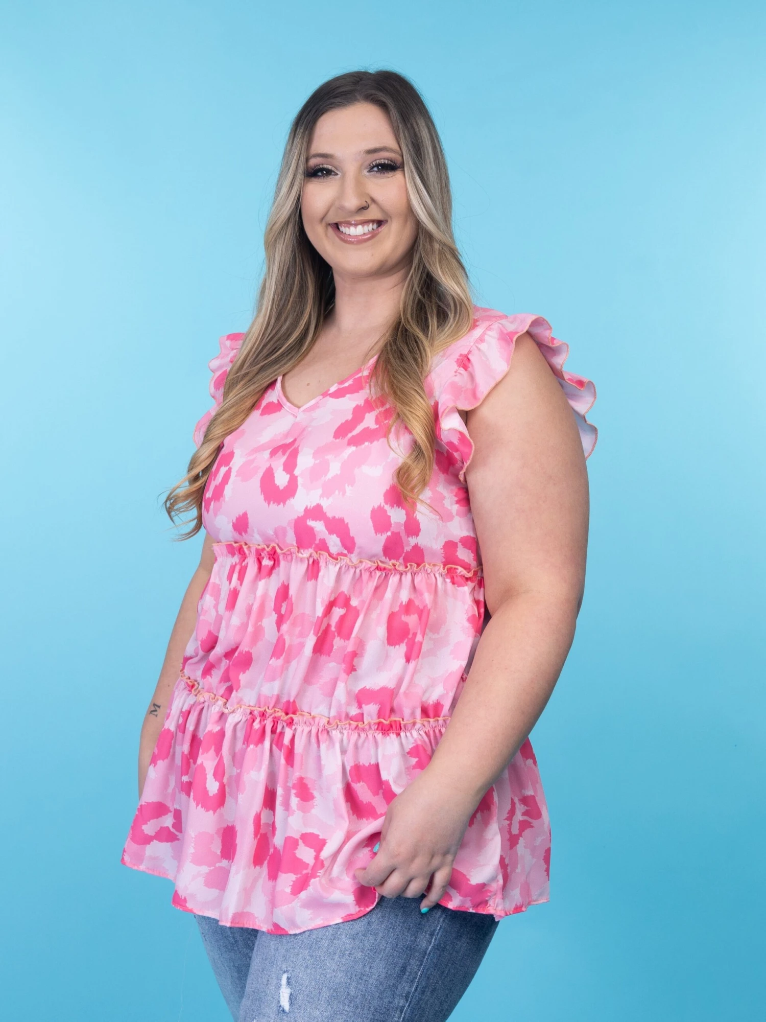 Pink + animal print = the perfect combo! This ruffled sleeve tiered top is just the pop of color your wardrobe needs!