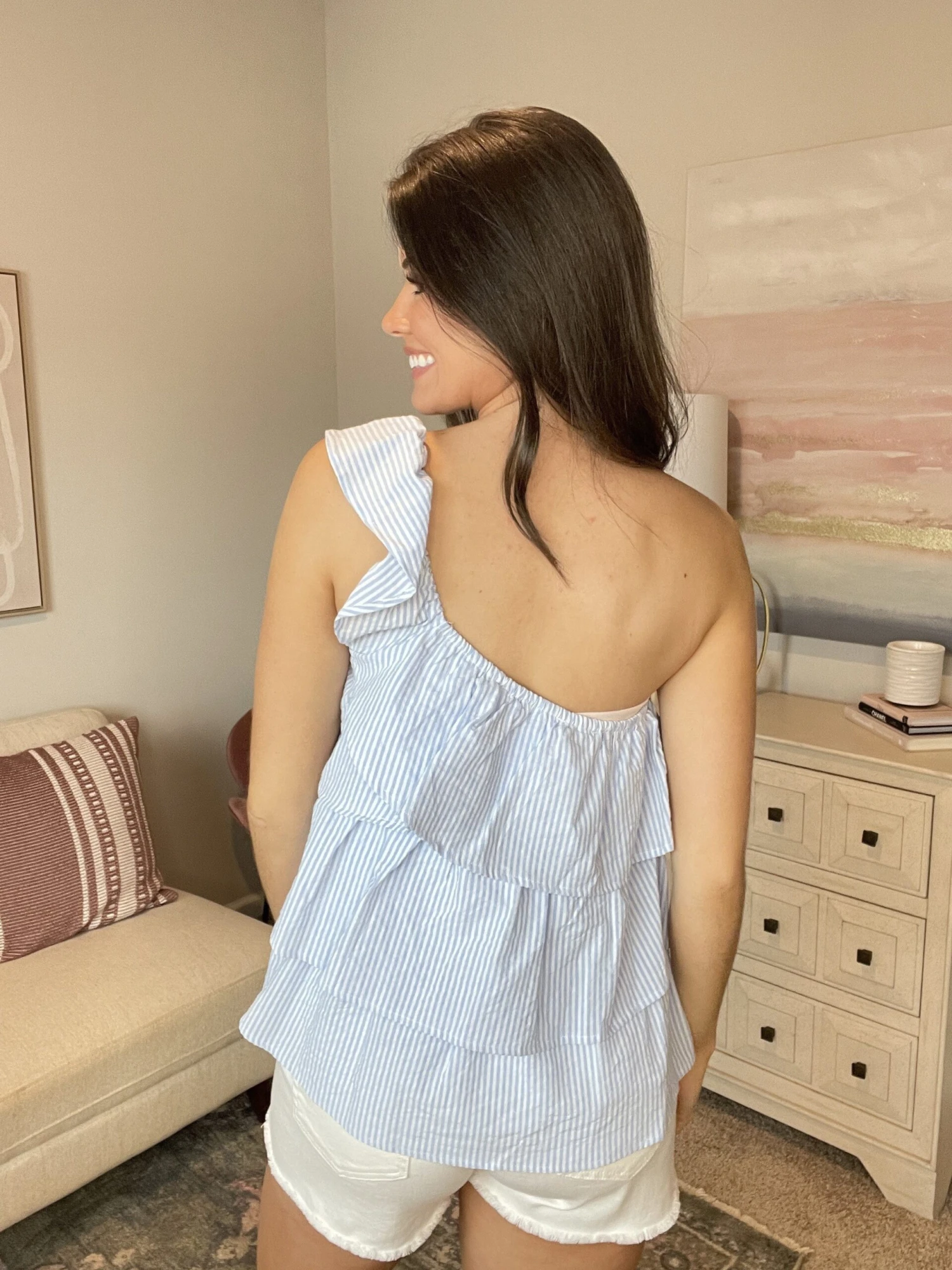 Features: Ruffle, Tiered, One Shoulder, Striped
