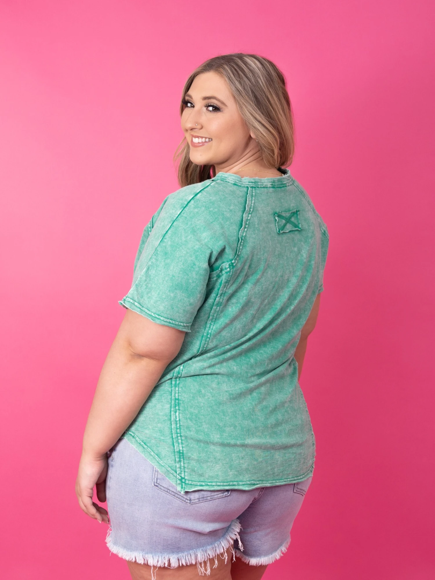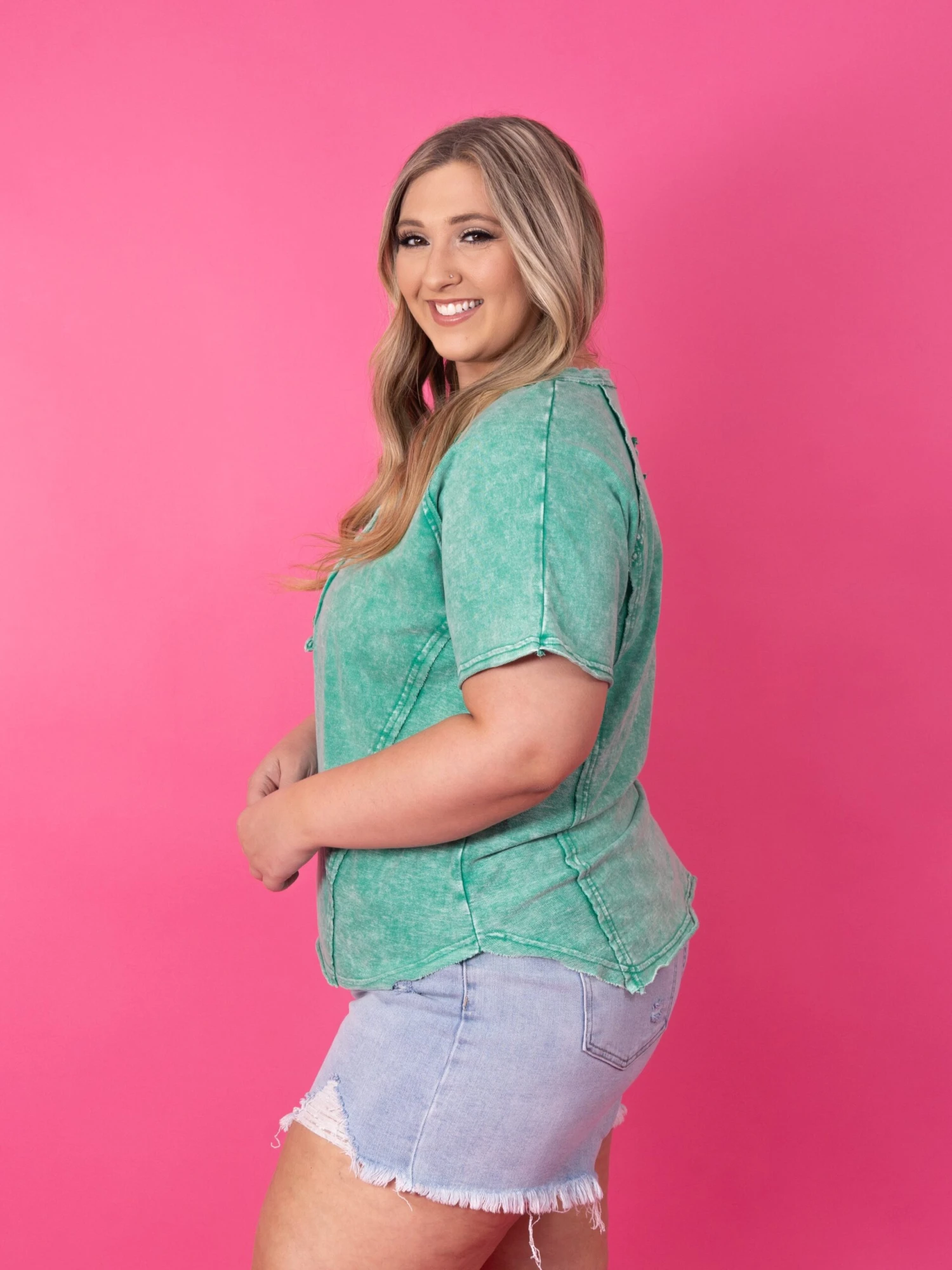 Features: Short Sleeves, Half Button Down, Raw Hem